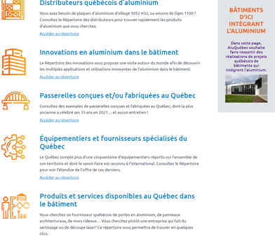 Pour parvenir à optimiser l’utilisation de l’aluminium dans les infrastructures telles que les ponts et les passerelles, AluQuébec met en ligne un répertoire des passerelles en aluminium conçues et/ou fabriquées au Québec, dont la plus ancienne, le Pont Banc, qui a célébré ses 30 ans en 2021 sans avoir nécessité d’entretien. Plusieurs autres répertoires seront par la suite créés et mis en ligne au fil des années.