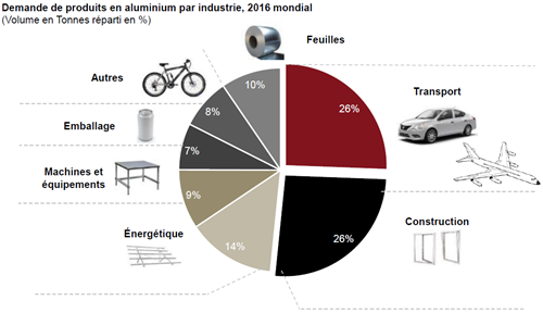À l’instar du secteur des transports, celui de la construction représente 26 % de la demande de produits issus de l’aluminium.