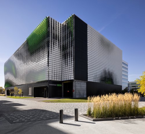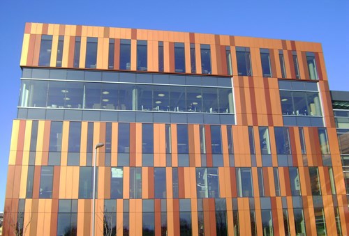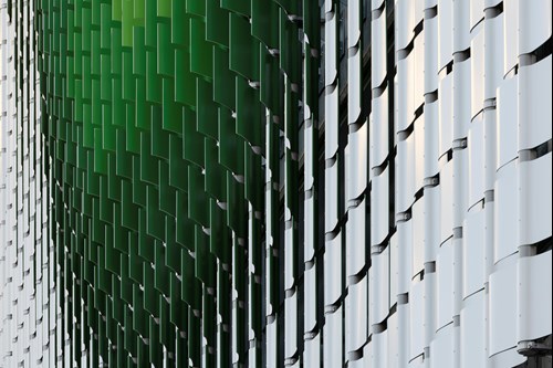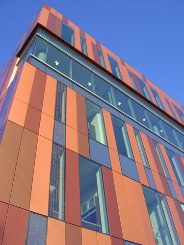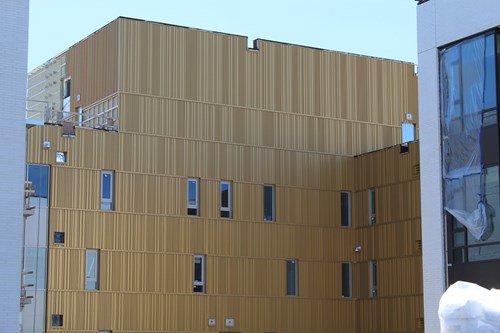 Description : Les architectes ont élaboré un concept d’un bâtiment avec une modulation verticale et horizontale avec 3 couleurs insérées aléatoirement,  avec 3 couleurs cuivrées métallisées : cuivre naturel, cuivre vieillit brunâtre et cuivre rouge.