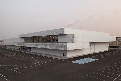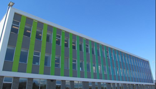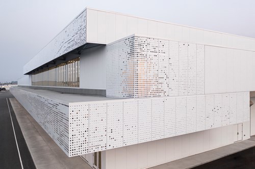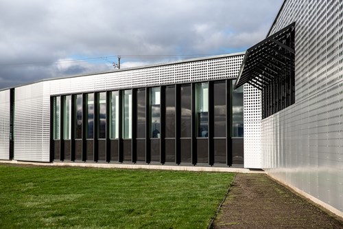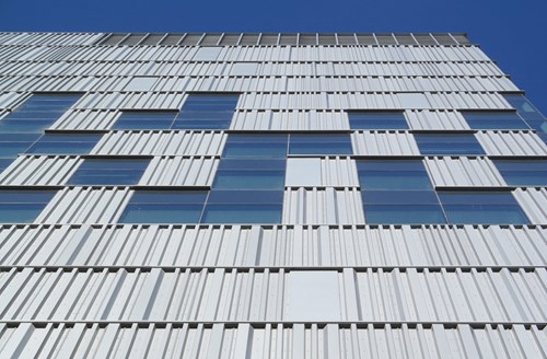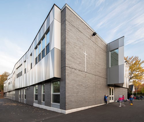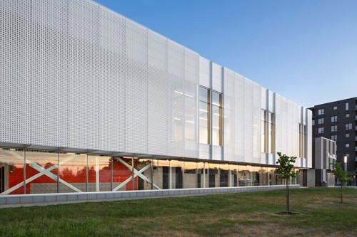 Description : Pour cette nouvelle école secondaire d’envergure, utilisation d’un profilé plié en aluminium, avec différents modèles assemblés, pour un design avec différents espacements des largeurs entre les nervures.
