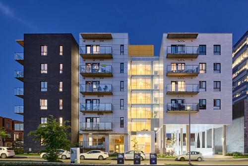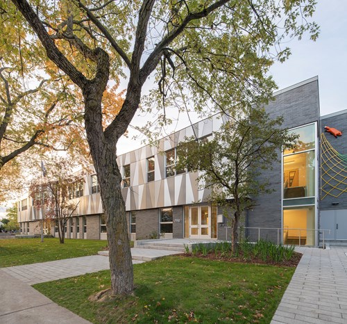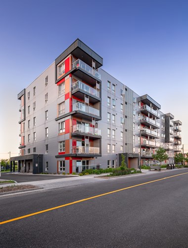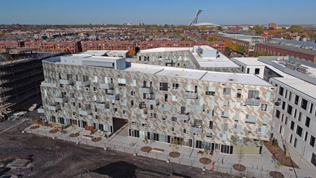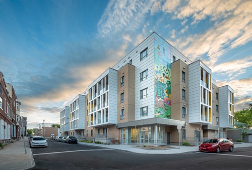 Description : Projet implanté sur le site de l’ancien centre Durocher dans le quartier St-Sauveur à Québec, un ancien quartier ouvrier de la basse-ville de Québec. L’aluminium a été choisi pour s’harmoniser avec les nombreux revêtements métalliques des bâtiments de ce quartier.