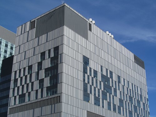 Description : Pour ce projet hospitalier d’envergure, à la première phase de réalisation du centre de recherche, utilisation aux étages d’un profilé plié spécial sur mesures, en aluminium prépeint de couleur spéciale développée pour ce projet.