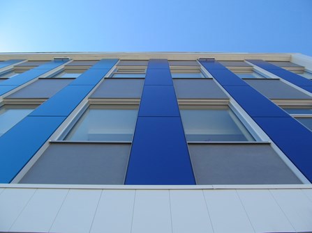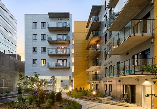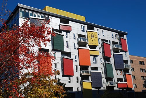 Description : Ce bâtiment a été conçu pour abriter des artistes à faible revenu. Les modules de briques colorées représentent la palette de l’artiste. L’aluminium anodisé clair a été utilisé pour son côté lisse et neutre afin de mettre en valeur les volumes colorés.