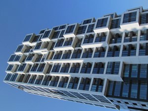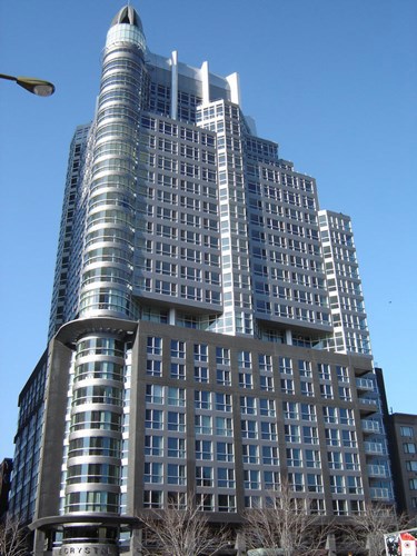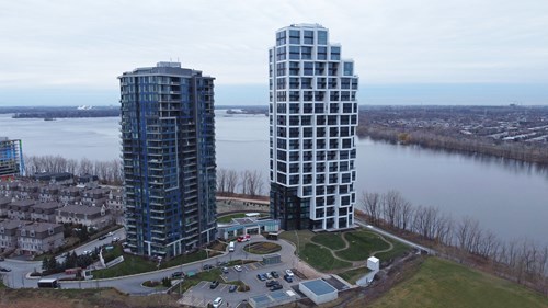 Description : Pour cette prestigieuse tour multi-résidentielle de 32 étages à l’Île-des-Sœurs, au design de cubes : utilisation du type PP-400 Panfab Plaque en fini prépeint D-MAX tel duranar XL couleur spéciale blanc RAL9003 = une couleur spéciale pour une tour spéciale!