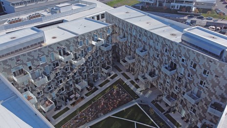 Description : Pour ce projet de condominiums, design de revêtement mural avec « petits formats » de bardage, installation en motif spécial répétitif type « pied-de-poule/tétris » = plus de 50 000 tuiles individuelles! Avec aluminium en finis spéciaux : série AluNatur (fini naturel avec fin lignage) couleur « Elox Champagne » et « Elox Pale Umber » et série EuraMica (à couleur changeante) couleur « Purple Green », perception selon l’angle de vision qui passe du pourpre au vert !