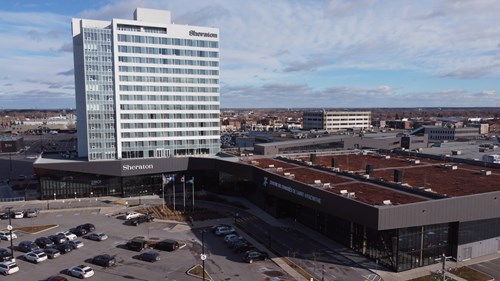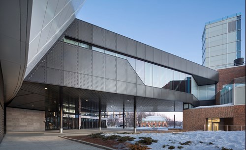 Description : Pour ce Centre des congrès de la ville de Saint-Hyacinthe, annexé à hôtel Sheraton, revêtement d’aluminium pour trois différents secteurs : fascia de grande marquise extérieure en couleur gris foncé anthracite, soffite extérieur et grand plafond intérieur en couleur cuivrée, avec perforation intégrée pour considération acoustique; en installation design de multi-angles.