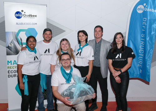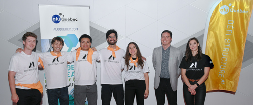 De gauche à droite : Antoine Pelletier (génie civil, Université du Québec à Chicoutimi), Luka Rano (design de l'environnement, Université du Québec à Montréal), Carlos Jose Herazo (génie de la construction, École de technologie supérieure), Samuel Flibotte (architecture, Université Laval), Chérine Bolzinger (architecture, Université Laval), Jean-François Lachance Benitez (conseiller en aménagement du territoire et mobilité, MRC de la Vallée-du-Richelieu) et Charlotte Laramée (présidente-directrice générale d'AluQuébec).